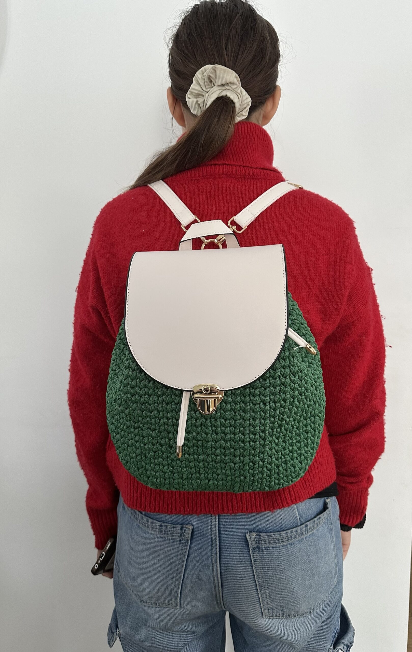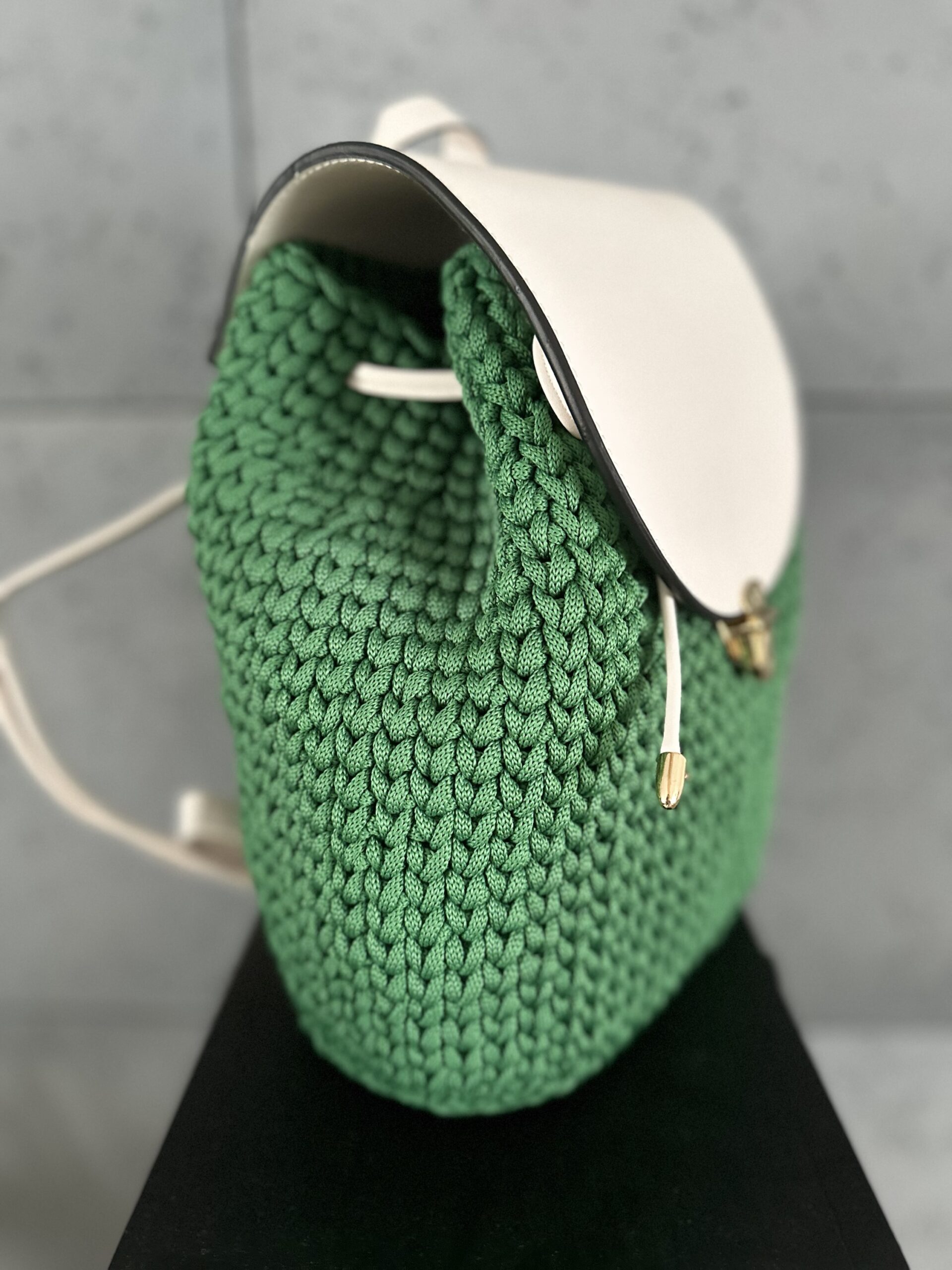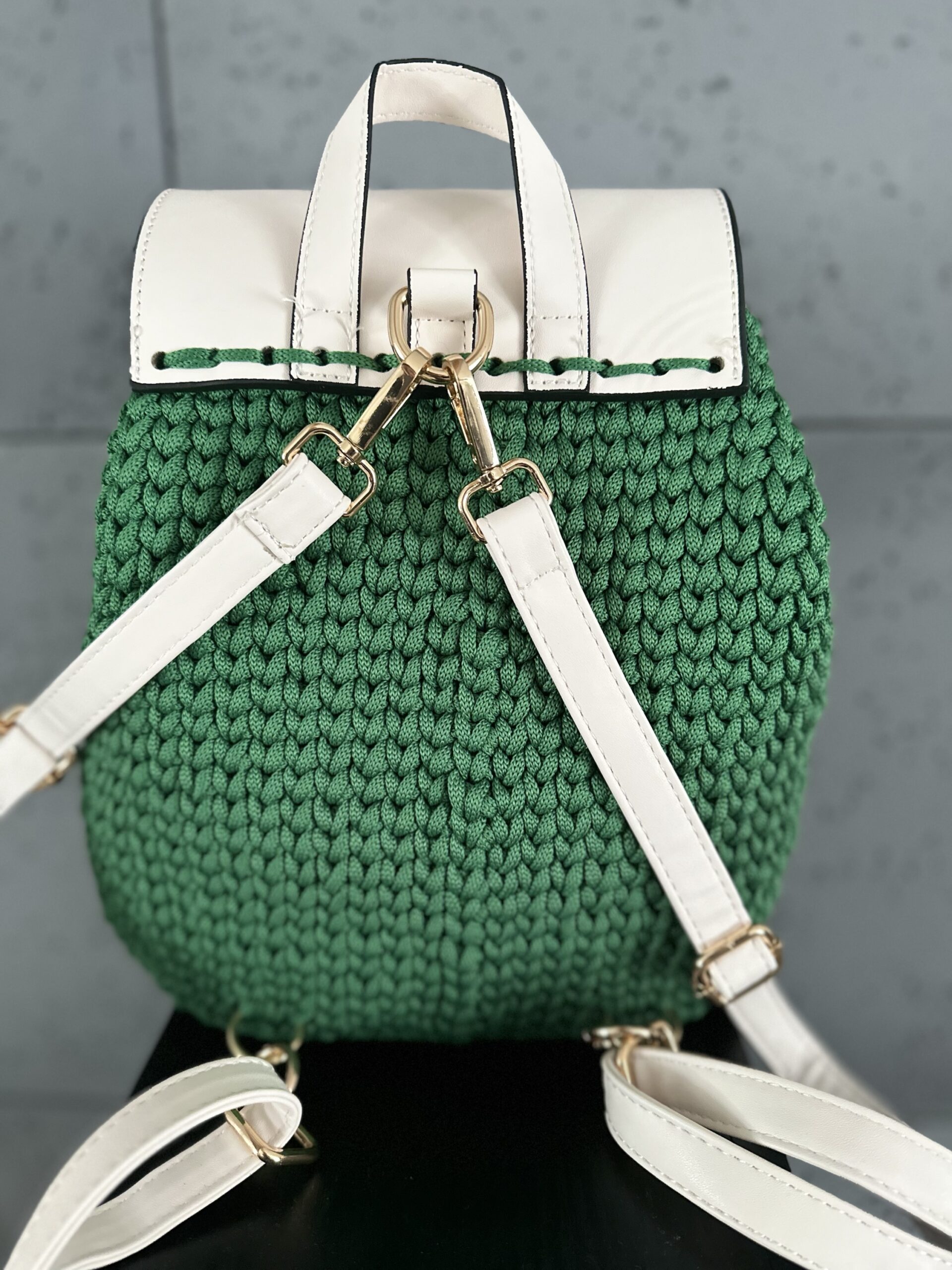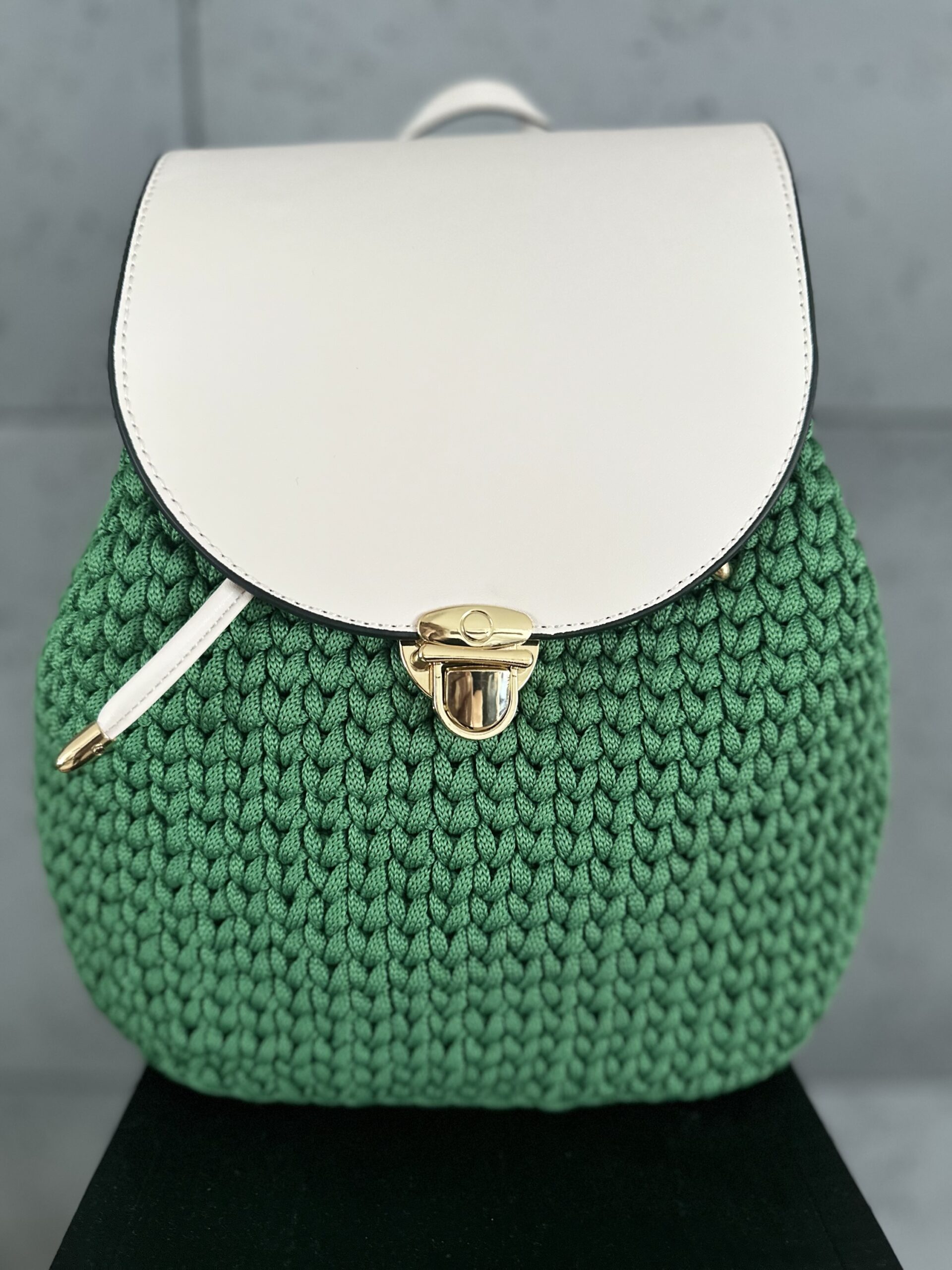 Dodatki skórzane w kolorze kremowym – klapa, dno, paski oraz ściągacz.