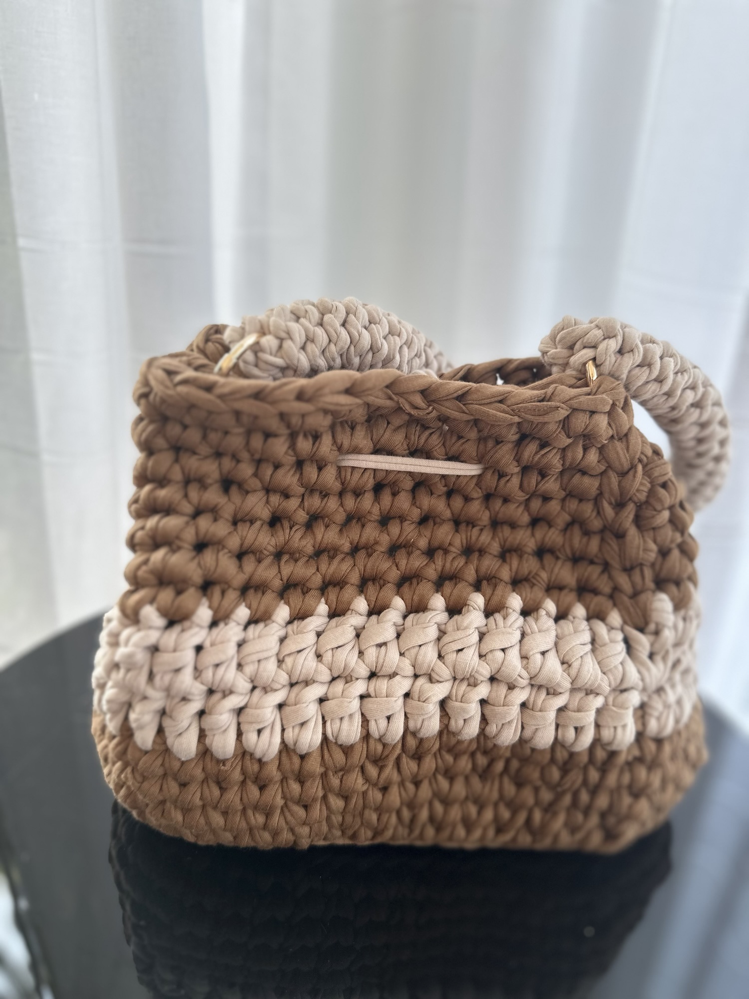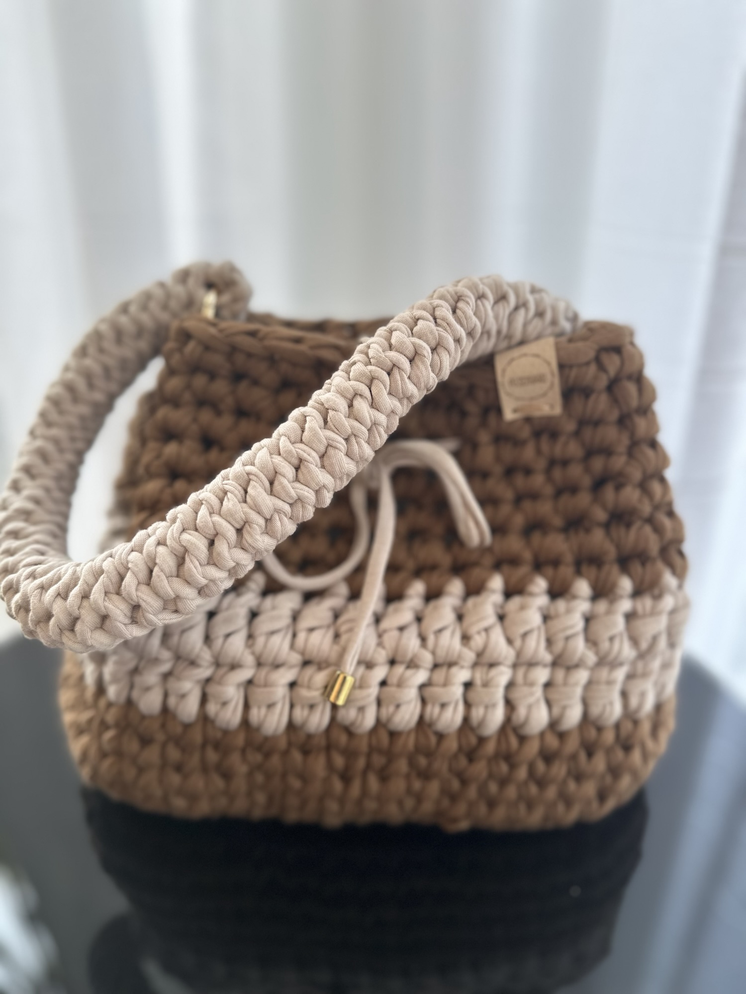 Torebka wykonana z przędzy T-shirt 100% bawełna.